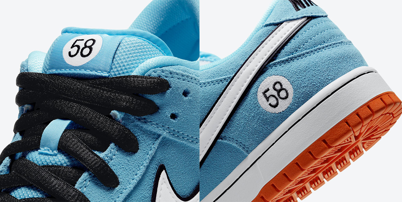 Dressed in a Blue Chill, Safety Orange, Black, and White color scheme. This Nike SB Dunk Low features a Blue suede upper with White leather Swooshes on the sides paired with Black detailing and branding throughout. Nike SB’s “58” insignia appears on the tongues and lateral heels completed with a White midsole and Orange-colored rubber outsole.